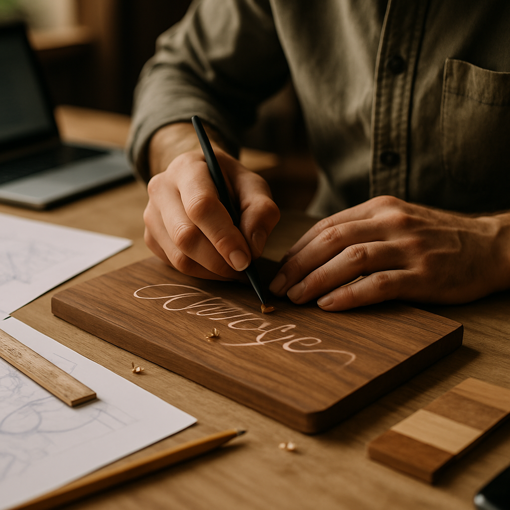 In der Werkstatt beginnt die Transformation: Holz wird zugeschnitten, die Schrift vorbereitet, geschnitzt oder graviert, Oberflächen behandelt. Qualitätskontrolle hat bei uns zwei Stufen: technische Kontrolle (Passgenauigkeit, Oberflächenqualität) und ästhetische Kontrolle (Schriftbild, Kontraste). Erst wenn beide Ebenen zufriedenstellen, verpacken wir sorgfältig und organisieren den Versand. Nachgelagerte Kommunikation: Pflegehinweise und Nachbetreuung — wir sind erst zufrieden, wenn Du es bist.